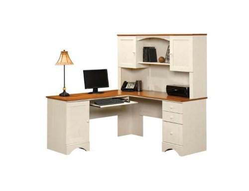 Sauder , Corner Desks This corner computer desk has a melamine top surface that is heat, stain, and scratch-resistant as well as a slide-out keyboard/mouse shelf with metal runners and safety stops. Its lower drawer holds letter or European size hanging files, and a storage area behind the door holds a vertical CPU tower. The door and the drawers on this computer desk can be fastened on the left or right side, and it has a grommet hole for cord management. This corner computer desk comes in Antiqued White or Antiqued Paint finish with American Cherry accents. This corner computer desk hutch can be fastened on the left or right side. Ships ready for easy assembly.